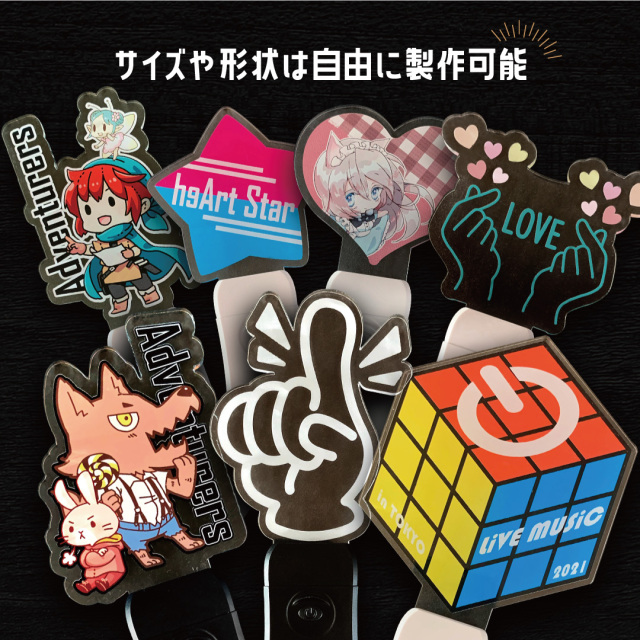 | サイズ・形状 | アクリル4mm厚 100× 80mm以内(ダイカット) 100 × 100mm以内(ダイカット) 130 × 100mm以内(ダイカット) 130 × 130mm以内(ダイカット) 円型 うちわ型 波円型 星型 ハート型 ダイヤ型 スティック型 |