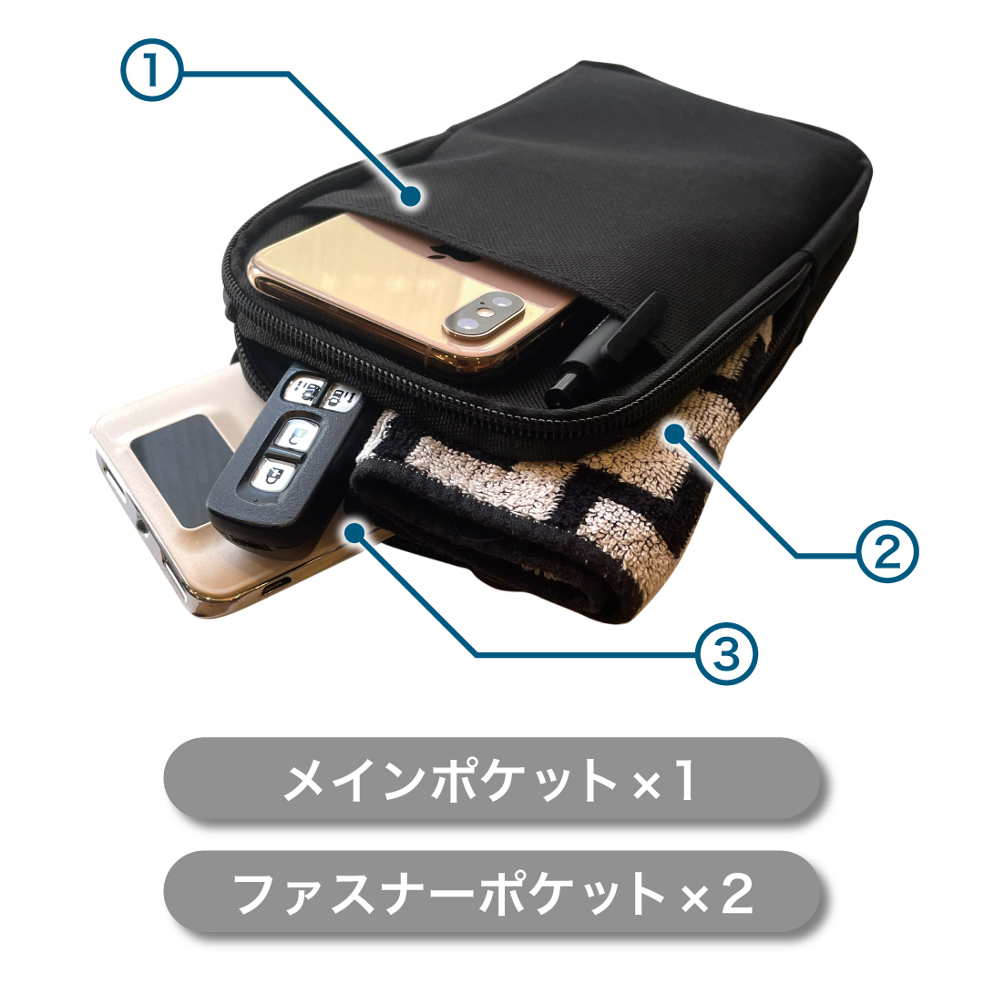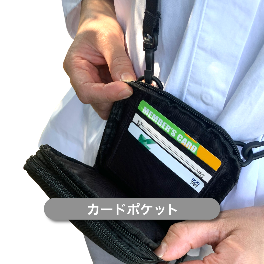 メインポケット1つとファスナーポケット2つのトリプルポケット仕様ですので整理整頓がはかどります。また、最背面のファスナーポケットの内部にはカードポケットを3つ装備しています。交通系のICカードや電子マネー、保険証などを収納しておけば、お財布としても活躍いたします。