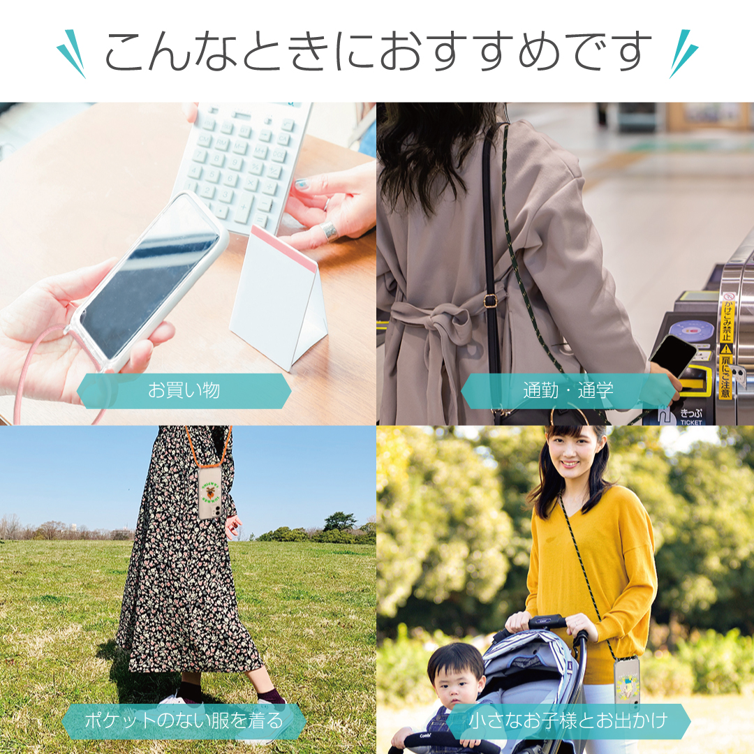スマホショルダーケースはストラップの両端を引っ張るだけで簡単に長さの調整が可能となっておりますので、エンドユーザー様のご利用シーンに合わせてスタイルを変えられます。