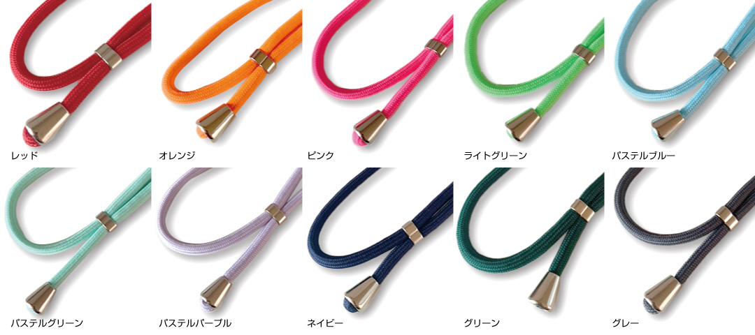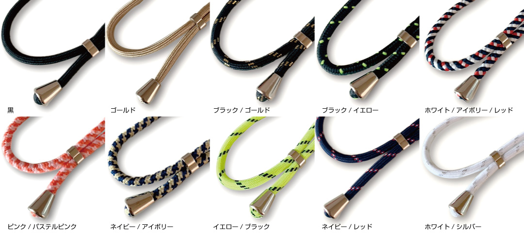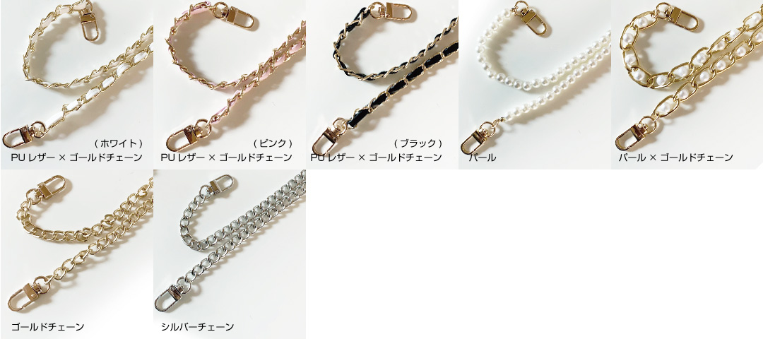 ショルダーストラップは紐タイプを定番カラー20色、チェーンタイプを7種類ご用意しております。デザインやイメージにあわせてお選びいただけます。