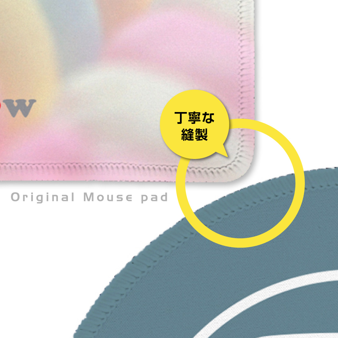 フチのフチまで綺麗な全面プリントが可能です。余計な余白が必要ないので完成イメージを邪魔せず、グッズの世界観を余すところなく表現できます。しかもフチ部分は切りっぱなしではなく丁寧に縫製を施していますので、ほつれ防止はもちろん、安っぽくならず頑丈なグッズ作成が可能です。