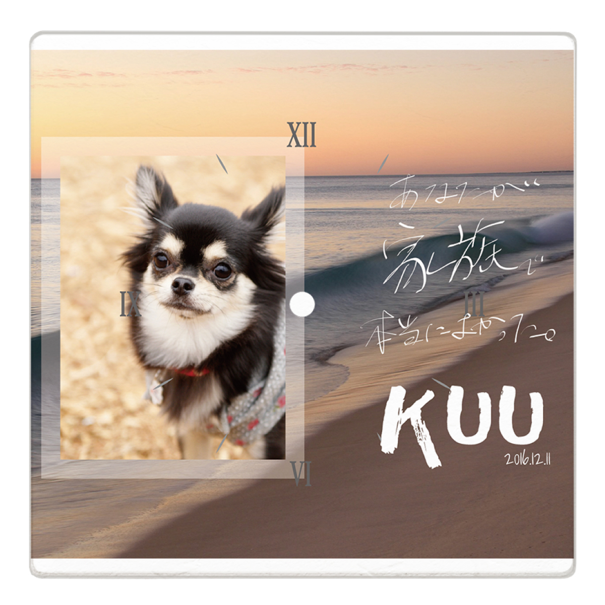 | 特徴 | 高級感のあるオリジナルのアクリル時計をデザインテンプレートを使って簡単に1個から作ることができます。透明度の高いアクリルを使用していますので、非常に美しい仕上がりとなります。お好きな写真やイラストを入れて作る、世界に一つだけのオリジナルアクリル時計は個人ユースだけでなく、記念品やプレゼント、オリジナルグッズにもオススメです。 |